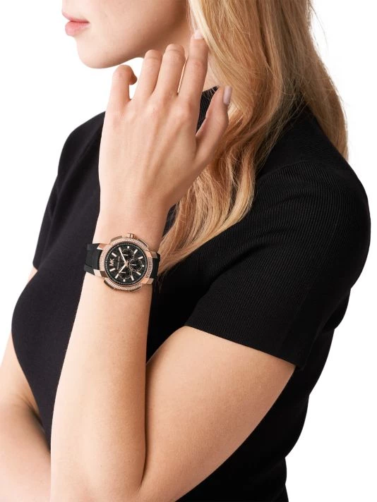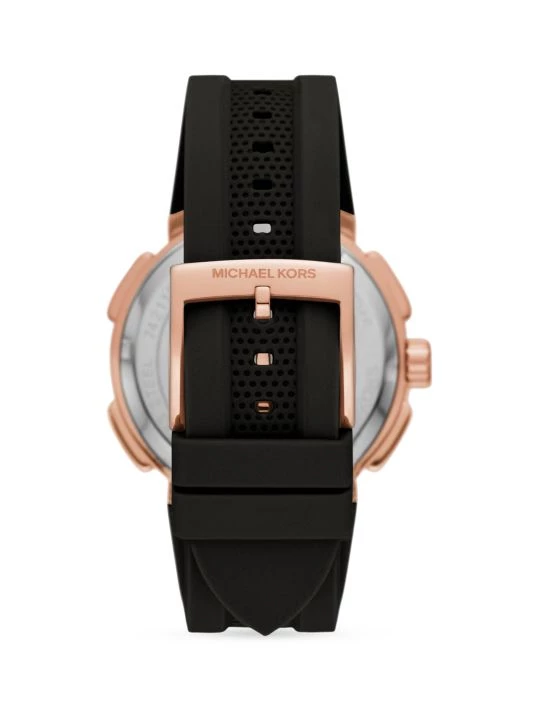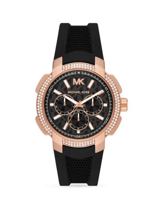 From the Sidney Collection. Michael Kors’ multifunctional rose goldtone watch features a sparkling crystal pavé bezel and black logo print dial on an ultra-flexible, perforated silicone strap.