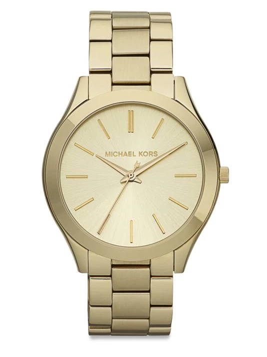 From the Slim Runway Collection. This classic timepiece will lend polish to any outfit, cast from stainless steel in a rich, radiant goldtone finish.