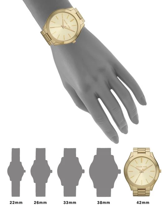 - Round polished goldtone stainless steel case, 42mm (1.65″)