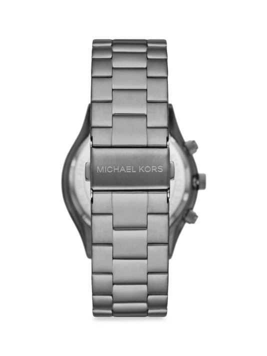 From the Slim Runway Collection. Crafted of gunmetal-tone stainless steel, Michael Kors’ watch features a round case, a blue chronograph dial, and a date display between four and five o’clock.