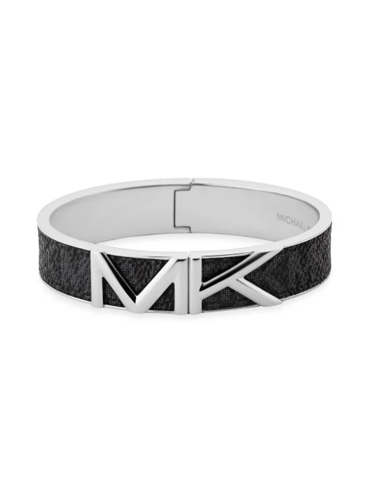 Crafted of stainless steel, Michael Kors’ hinged bangle showcases the label’s signature monogram logo.