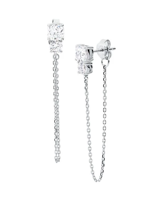 Crafted of sterling silver, Michael Kors’ earrings showcase a cushion- and round-cut cubic zirconia stud joined to a slender chain that wraps delicately around the earlobe.