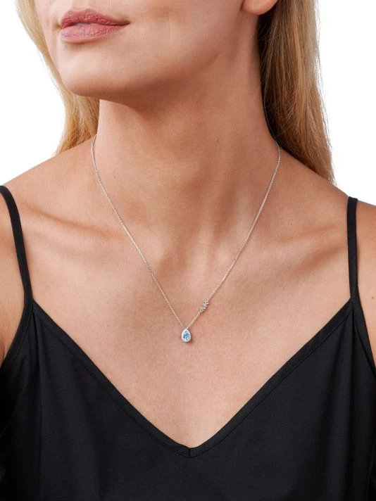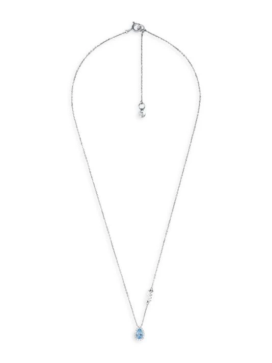 Michael Kors’ sterling silver necklace features a petite teardrop pendant embellished with light blue and white cubic zirconia. Secured with a spring-ring clasp, this dainty piece is accented with the designer’s iconic monogram at the chain.