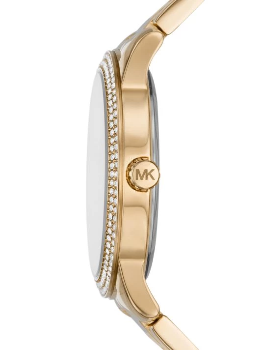 - Goldtone sunray dial with pavé glitz indexes